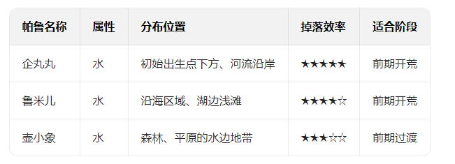 - 误区 1:所有水系帕鲁掉落率一样?错。低等级帕鲁(如企丸丸)的掉落率反而比高等级帕鲁(如企丸王)更高,刷低级怪更划算。