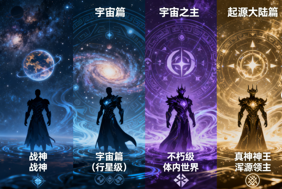 - 宇宙篇:核心是法则领悟与生命层次突破,每个大境界都需对应法则感悟达标(如域主需触碰到基本本源法则,不朽需悟透下位法则),同时伴随神体、神力的质变。