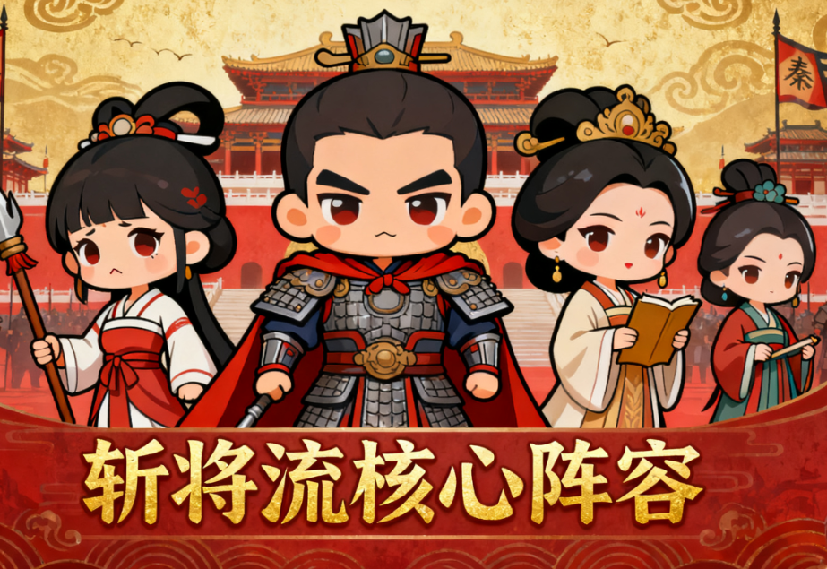 斩将流的标准阵容为:孟姜女 + 白起 + 赵姬 + 芈月 ×2 + 1 个自由位。