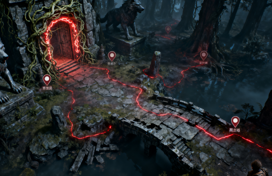 - 苍狼林:作为起始区域,除了沿主路推进主线,还需留意左侧小径,深入后能找到佛头标记的隐藏区域,其中藏有 “色蕴” 宝藏,是前期提升实力的关键。