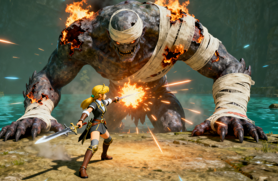 打起来别瞎跑,赶紧贴近 BOSS,在它旁边放攻击类设施持续输出就行。它的常规重击、横扫攻击前摇都挺长,看到它抬手就往旁边闪,完全能躲开。另外,用火属性武器打能烧破它外层的绷带,让它变脆;用电属性攻击能直接把它打懵(就是硬直状态),趁这个时候猛输出准没错。