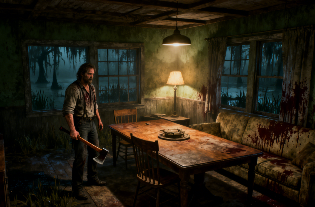 进入客厅后触发与杰克・贝克的首场战斗,利用餐桌、沙发等障碍物绕圈周旋,避免被其斧头连续攻击。建议战斗前在二楼卧室找到存档点,及时保存进度,防止资源耗尽后重新开局。
