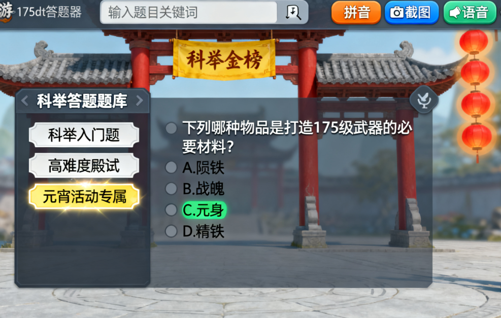 题库涵盖梦幻西游全类型答题活动,无论是常规的科举答题(含乡试、会试、殿试各环节题目),还是节日限定的元宵节猜灯谜、中秋节答题等活动题目,都能在175dt答题器中找到精准答案。题库还会根据游戏版本更新实时同步,确保新增答题活动的题目及时收录,让玩家无需担心因题目更新导致答题器失效的问题。