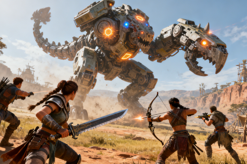 说起来《地平线:钢铁边境》能和大家见面,全靠 NCSOFT 开发团队是实打实的 “原作死忠粉”!当初他们沉浸在《地平线》里那种 “蛮荒部族遇巨型机械兽” 的奇幻世界后,直接上头了,满脑子都想让 PC 和手机玩家也感受到这份震撼,最后总算促成了和索尼 Guerrilla 工作室的联手。游戏核心就是 “组队狩猎巨型机械”,原作里超受欢迎的钩索飞檐走壁、精准戳机械兽弱点、布陷阱阴怪、骑机械坐骑猛冲这些操作,全都原汁原味保留下来了,狩猎的爽感直接拉满!